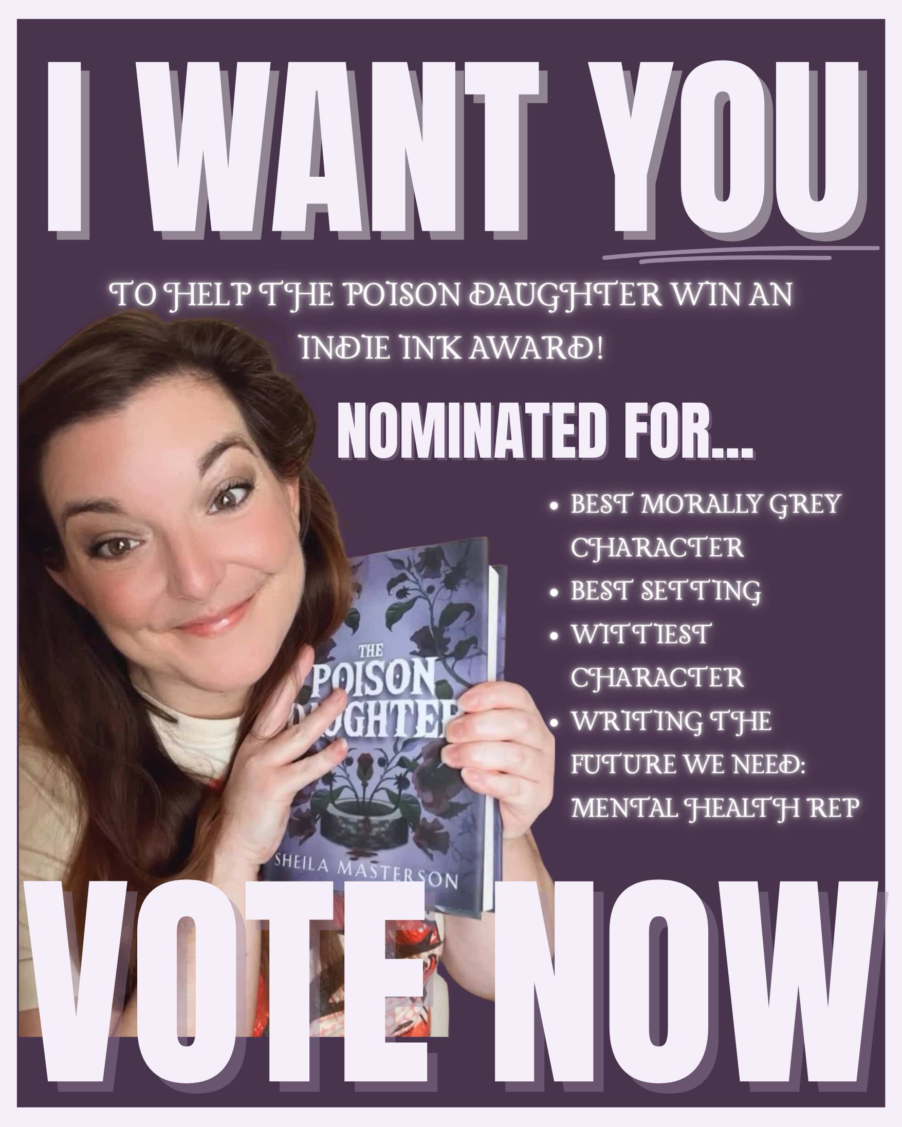 Even more exciting news! On the heels of THE STORM KING winning Indieverse awards for Boundary Pushing (discussing difficult subjects with tact) and Character with the Most Growth (Xander), THE POISON DAUGHTER has been nominated for FOUR Indie Ink Awards.