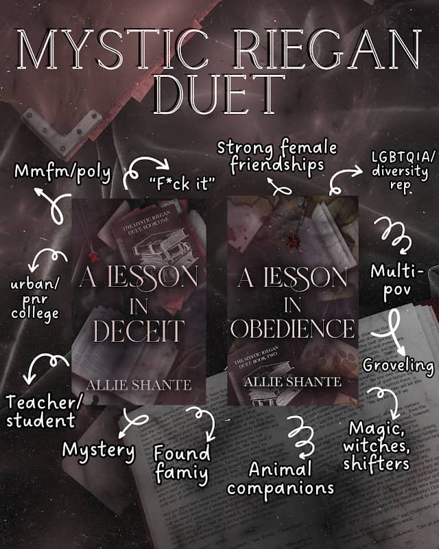 A Lesson in Obedience (Mystic Riegan Book 2) by Allie Shante- I am so excited for my girl, Allie, completing this duology this week. Avoicing spoilers by telling you a little about book one. When a mysterious tragedy turns Riley's world upside down, she is determined to find the truth. She takes matters into her own hands, by enrolling at Mystic Riegan University, a school that caters to both humans and magic wielders. Unfortunately, flying under the radar to poke around won't be as easy as Riley hoped, because she's caught the attention of three mysterious and sexy men. I am so excited to dig into this poly romance, and it's coming soon to audio!!! Click the graphic below to check it out.