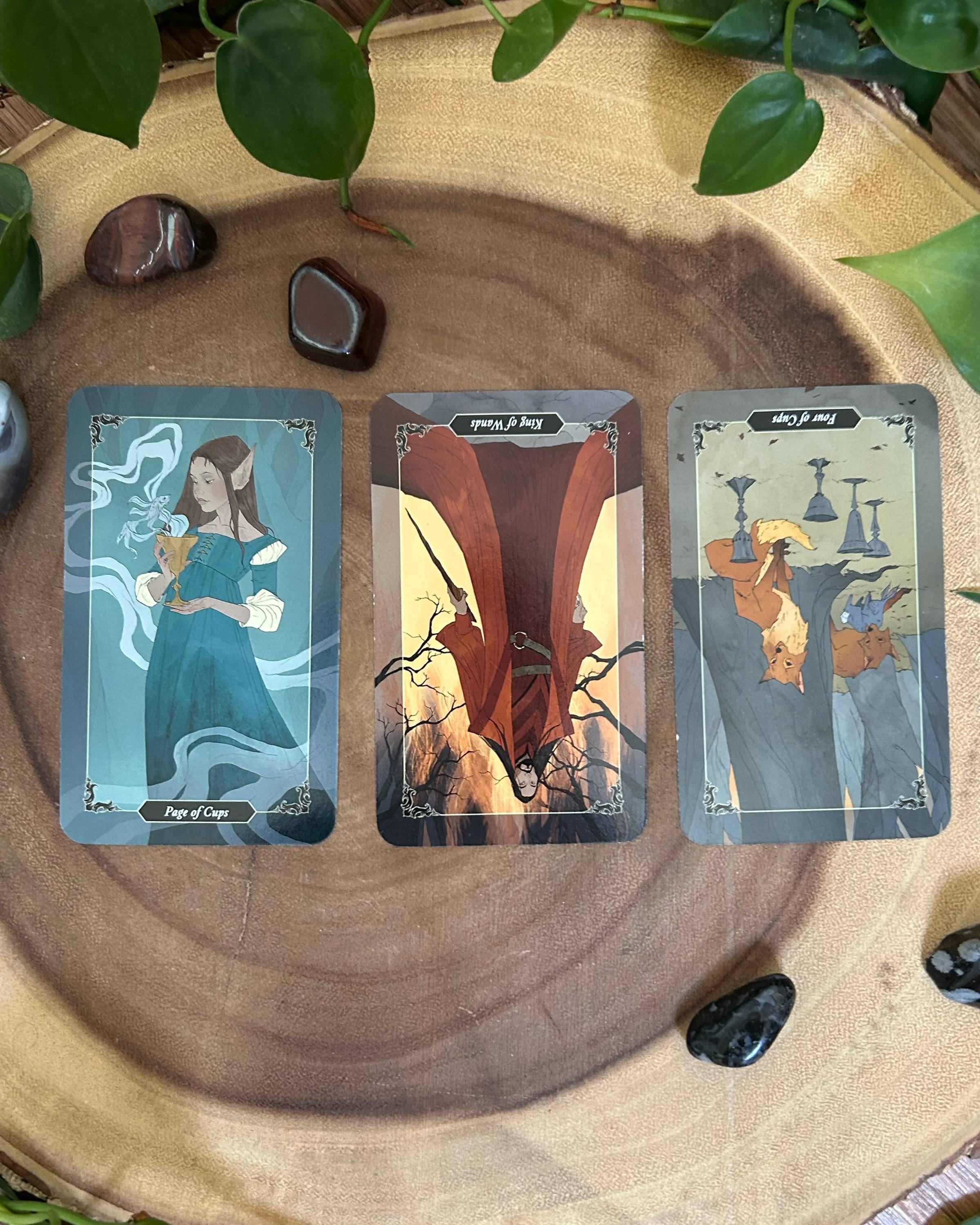 Three cards from the Dark Wood Tarot face down on a wood surface